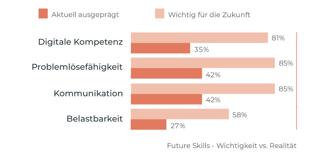 Anders formuliert: Bei den entscheidenden Future Skills liegt Ihre Belegschaft 40-50 Prozentpunkte hinter dem zurück, was sie selbst für notwendig hält.
